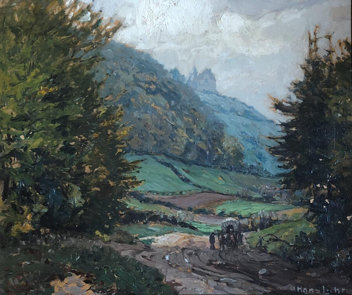 Hans Licht führt uns weiter durch Schwalenberg: ein Straßenzug aus den 1920er Jahren, belebt von Menschen, Tieren und dem alltäglichen Durcheinander der historischen Kleinstadt. Amüsiert widmet er sich dem Federvieh, das sich in einer Mistkuhle vergnügt – ein Motiv, das er mit kräftigen Farben und breitem Pinselstrich in ein „kleines Fest des Lichts“ verwandelt. Ganz anders wirkt sein „Forstweg mit Blick auf die Schwalenburg“: Das Bild strahlt eine sanfte, schöne Einsamkeit aus. Der Blick führt in eine Waldlichtung, die den Betrachter mit seinen kühlen Grün‑ und Blautönen umfängt. Die Stadt liegt unsichtbar hinter dem Berg. Nur die Burg taucht in der Ferne wie ein Orientierungspunkt aus zartem Dunst auf.
