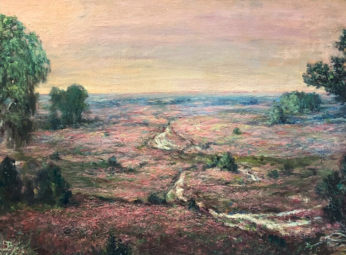 steht auf einem Hügel über dem Elbdelta. Vor ihm breiten sich bewaldete Hügel und in der Niederung Wasserflächen aus, die in Blau, Türkis und Grün schimmern. Sonnenstrahlen brechen durch schwere Kumuluswolken und legen sich wie wandernde Lichtinseln auf Hügel und Flussarme. Auch Bruno Wittenstein hat einen erhöhten Standpunkt gewählt. Von dort aus schaut er über die Schäfertrift am Kreuzkrug im Teutoburger Wald, wo die Heide im warmen Licht der untergehenden Sonne aufglüht. Das Rosa der Erika scheint fast zu schweben – ein Farbenspiel, das die Stille des Moments trägt.